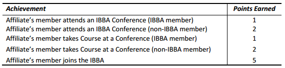 So, affiliate members, start collecting those points by registering now for the IBBA Spring Conference and Courses. Each month, the IBBA newsletter will update how each of the Affiliates is doing in this “Race to the Grand Prize”.
