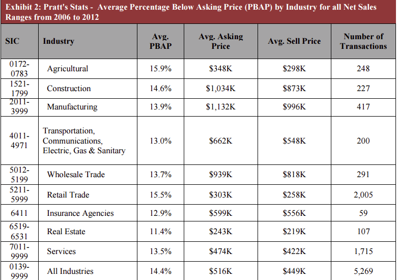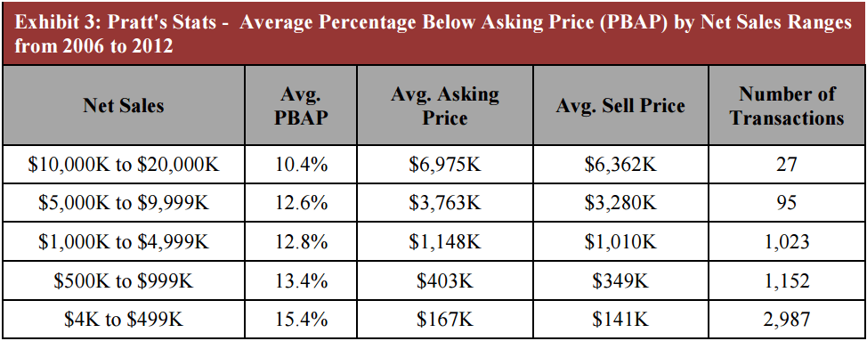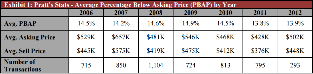 While looking over the last seven years from 2006 to 2012, the APBAP has been consistent at about 14.3% (as seen below). This shows that even with the highs and lows of the economy, the APBAP remained relatively constant. Also seen below, the average asking price and selling price of the deals specific to Pratt’s Stats have varied over the years with the lows being in 2010 and 2011 and the highs in 2007 and 2009.