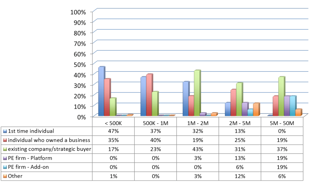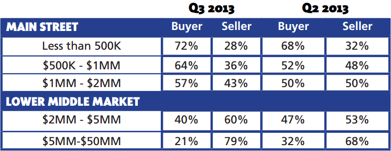 Private equity firms jumped up this quarter to tie existing companies as the number one buyer for businesses over $5 million in value. Private equity acquisitions were divided equally as 50 percent platform deals and 50 percent add-ons. As in second quarter 2013, individual buyers dominated Main Street.