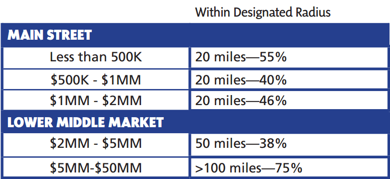 In the same way that larger deals take more time to close, they are also more likely to draw buyers from farther away. In third quarter 2013, 75 percent of the buyers for deals valued over $5 million came from outside a 100 mile radius of the seller’s location. For Main Street deals, 40 percent or more of buyers came from within a 20 mile radius.