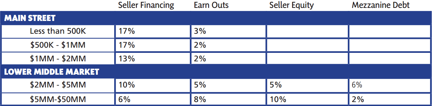 As the deals get larger, seller financing declines but earn outs increase. Once deal size reaches $2 million and higher, seller retained equity and mezzanine debt comes into debt.