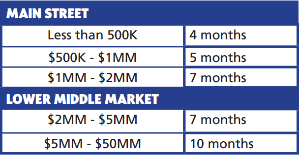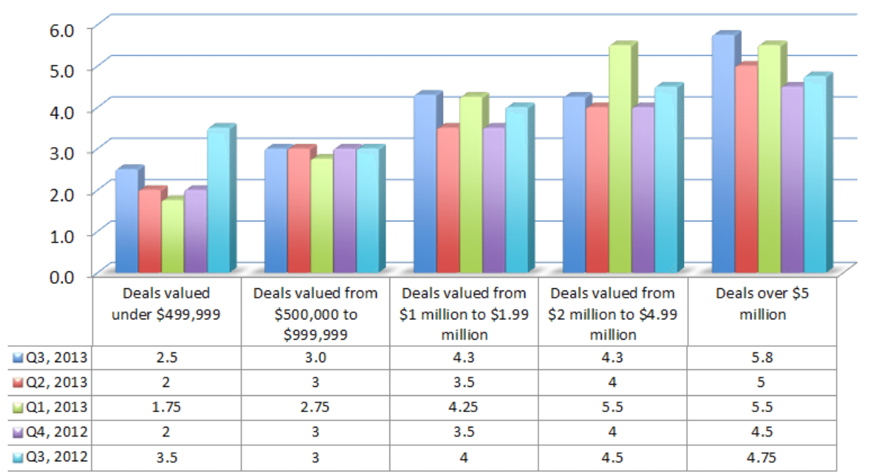 The third quarter 2013 study continues to confirm earlier findings that larger businesses take longer to close. In the smallest Main Street sector (businesses valued at $500,000 or less), the median time to close was four months. In the lower middle market, for businesses valued over $5 million, the median time to close was 10 months.