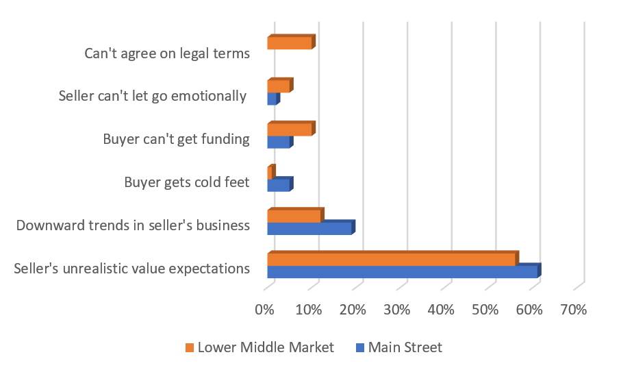For Q3, 2019, Figure 1 shows that almost 2/3 (61%) of Main Street deals fail to sell due to unrealistic value expectations by the Seller and just over half (56%) of the Lower Middle Market businesses.