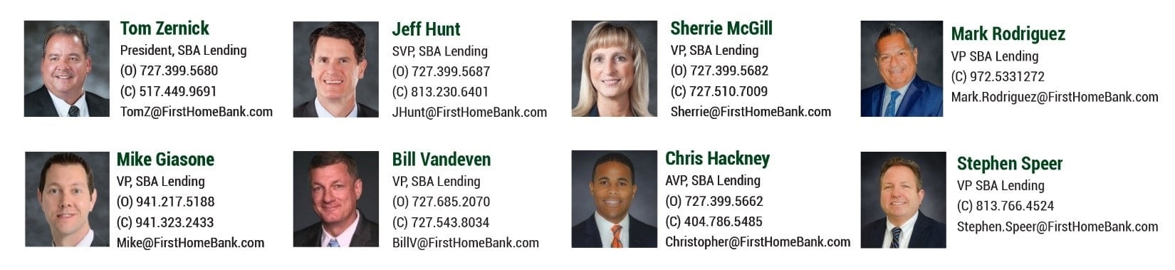 Companies that need to secure funding should turn first to an SBA partner to see firsthand the benefits that SBA loans can provide. First Home Bank is a Top 10 Preferred Lender with SBA with an experienced team to assist with questions regarding SBA financing. They take pride in helping find the best solution for your business.