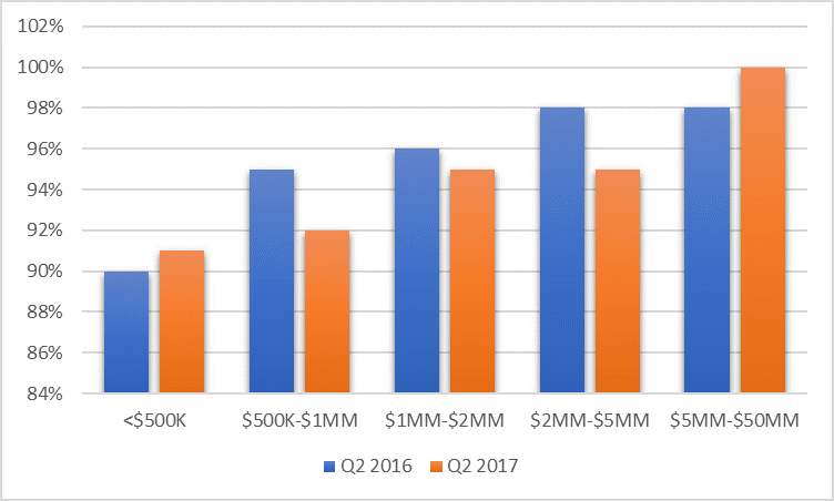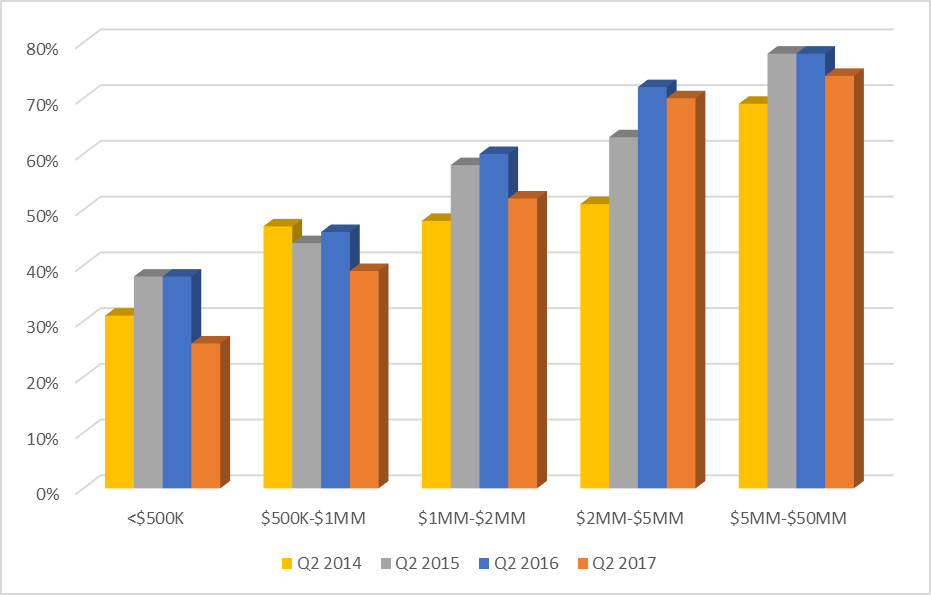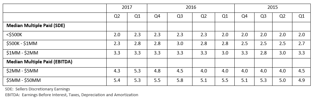 Multiples remain fairly strong, with declines back to Q1 2016 levels for the smallest Main Street segment and not seen since Q1 2015 in the $500k-$1MM Main Street segment. Year over Year multiples for both Lower Middle Market segments showed gains, however, the $2MM-$5MM showed a 1 point decline from Q1. Simply stated, if a business had $500,000 in EBITDA and the Q1 2017 price at a 5.3 multiple was $2,650,000 whereas in Q2 2017 it was $500,000 less at $2,150,000 on average.