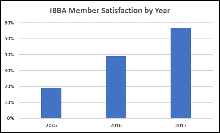 Speaking of success, our latest member satisfaction survey indicates our membership also believes we are moving in the right direction. allyAMC implemented this survey in 2015 when they were hired by the IBBA to set a base line and gauge improvement each year. In 2015, we had a 19% membership satisfaction score. Considering the scores range from -100% to +100%, our score fell in a normal range. In 2016, we had a 39% membership score, which was a great improvement and a very good score. The really amazing news is that our membership gave us the 57% satisfaction score in 2017, which ranks us with some of the very best organizations in the country (Google ‘Net Promoter Score’ if you’d like to learn more about this survey methodology, and just how impressive a 57% score is.)