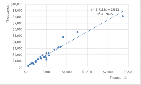 The R-Squared test is a function available in Excel (RSQ). I would challenge you to run this test of data cohesion on other databases. I have, and the clear winner is PeerComps. In other databases, I occasionally get a score in the 75% – 80% range, however in most cases to get there I would need to eliminate numerous outliers. I have found PeerComps to be more accurate, composed of reliable data, and as with the example above I did not have to remove or add any data points.