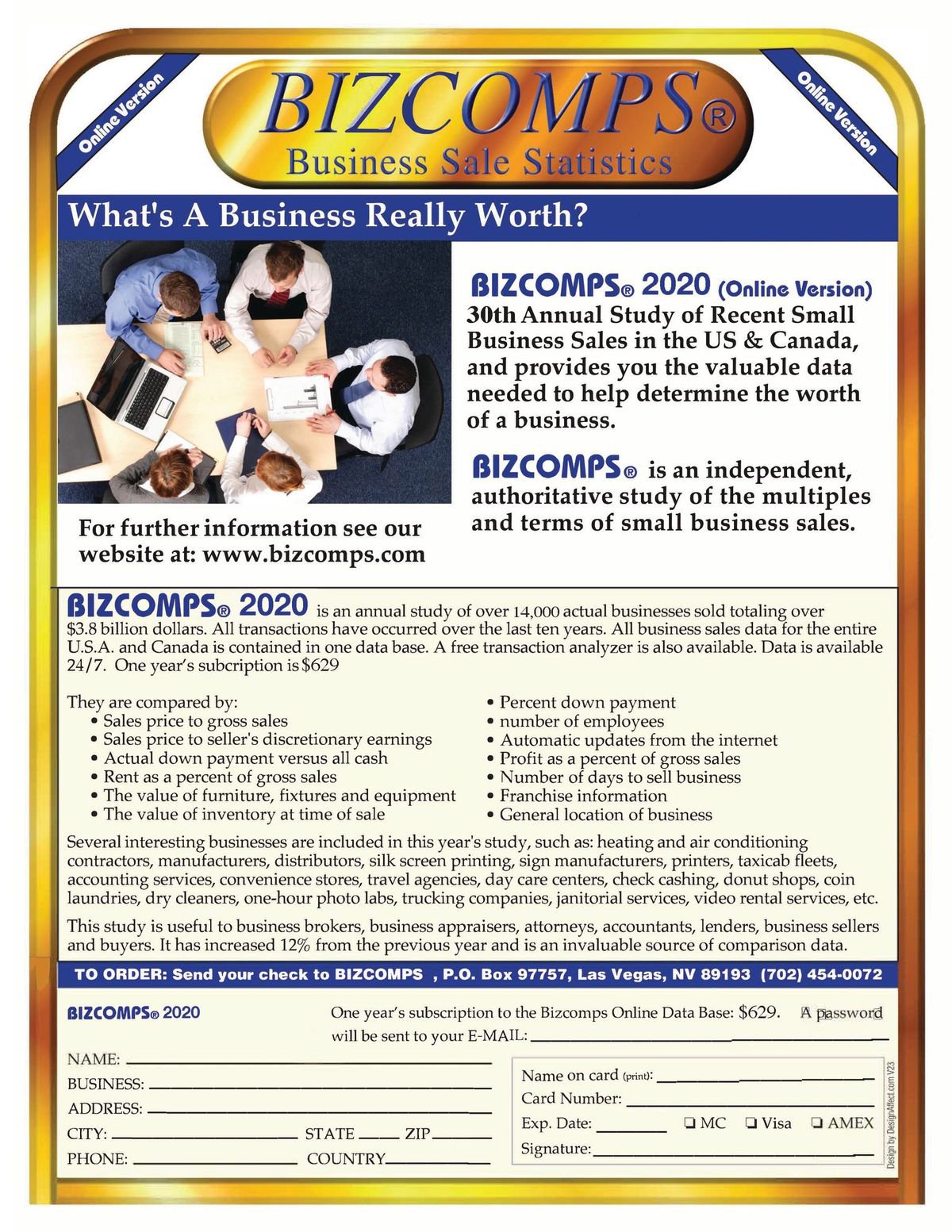 The BIZCOMPS® transaction database of small business and main street transactions was initiated in 1990 to report financial information about small business sales in the market place. Since its inception, BIZCOMPS® has accumulated and reported data on over 25,000 transactions in the United States and Canada. The data is available by subscription and is generally limited to the last 10 to 12 years for currency. For more information contact: [email protected] or call direct at: 702-259-7711